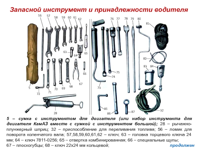 с инструментом большой); 28 – рычажно-плунжерный шприц; 32 – приспособление для переливания топлива; 56 – ломик для поворота коленчатого вала; 57,58,59,60,61,62 – ключ; 63 – головка торцевого ключа 24 мм; 64 – ключ 7811-0256; 65 – отвертка комбинированная; 66 – специальные щупы;