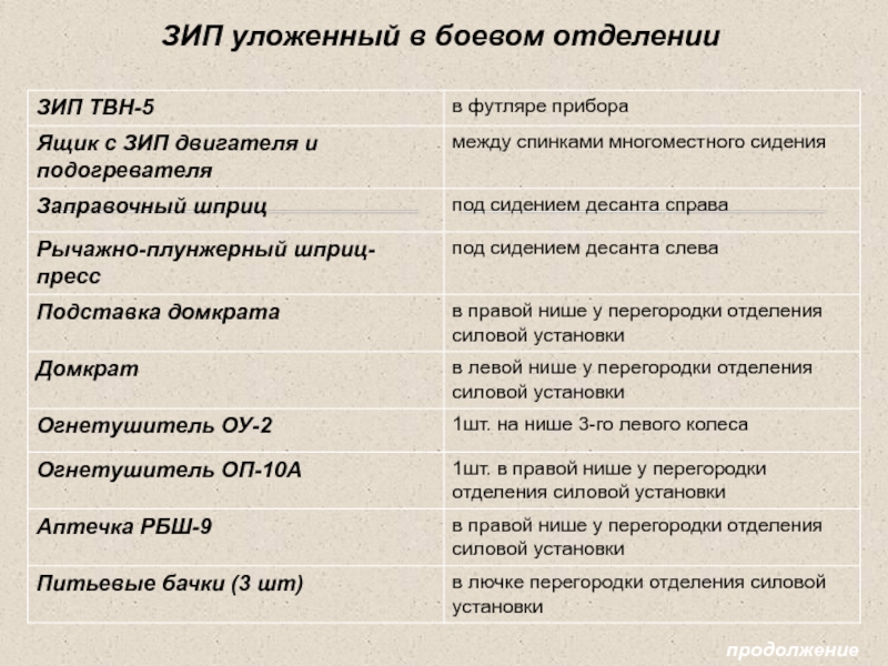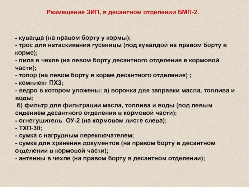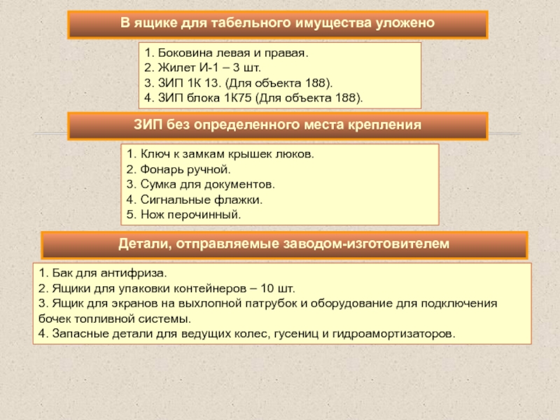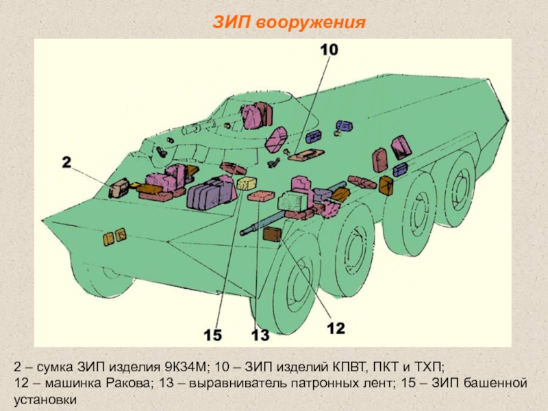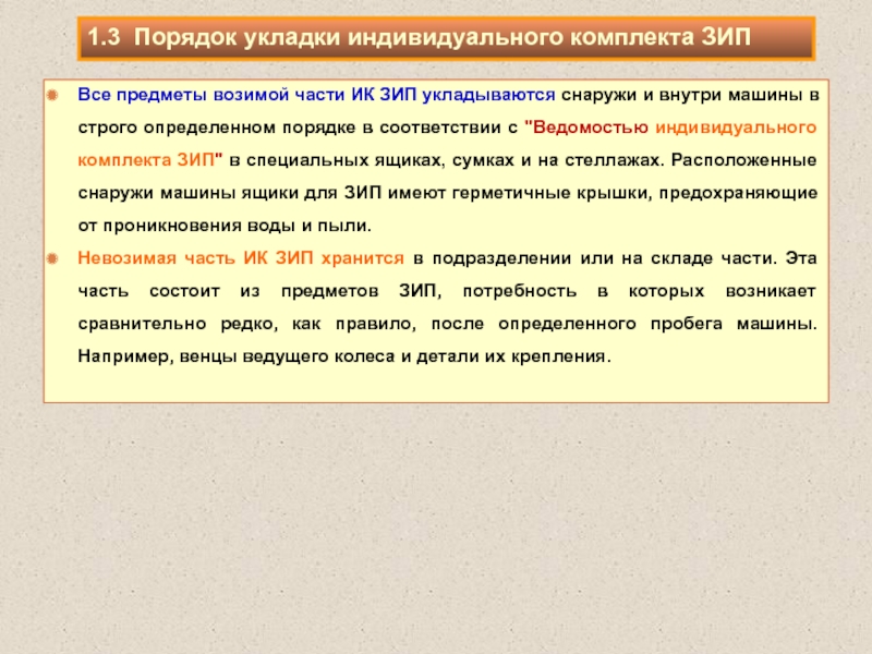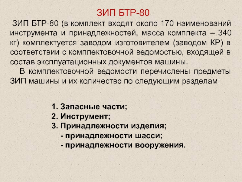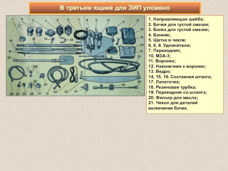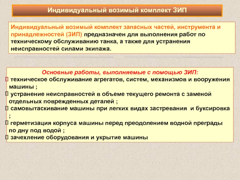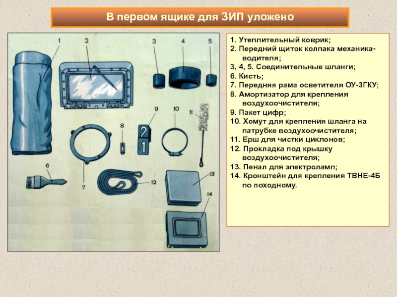 Слайд 12Индивидуальный возимый комплект запасных частей, инструмента и принадлежностей (ЗИП) предназначен
