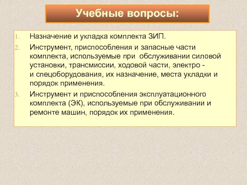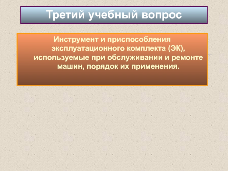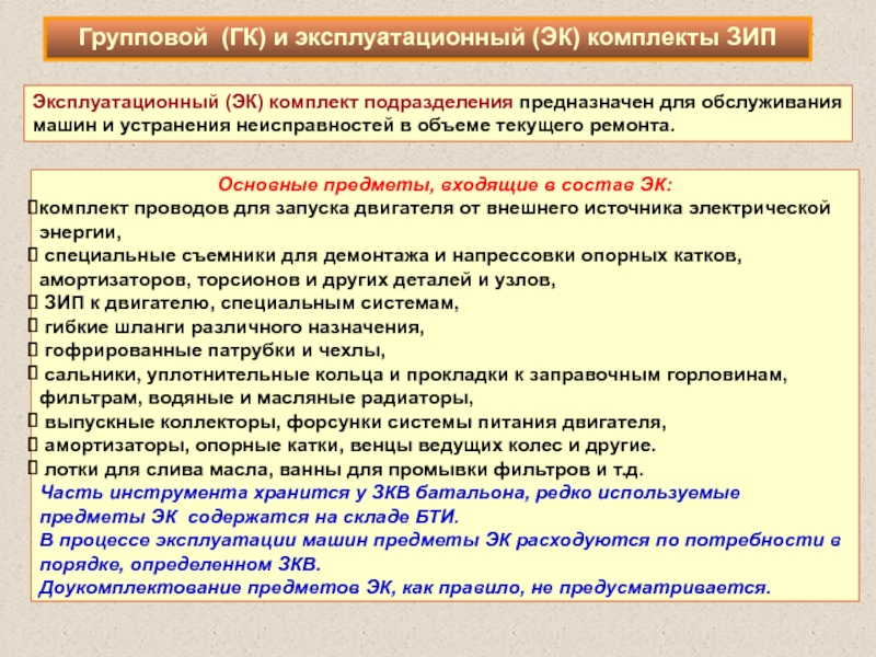 Слайд 90Эксплуатационный (ЭК) комплект подразделения предназначен для обслуживания машин и устранения