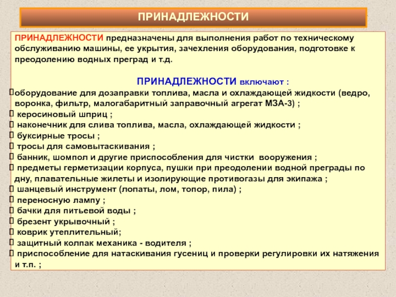Слайд 10ПРИНАДЛЕЖНОСТИ предназначены для выполнения работ по техническому обслуживанию машины, ее