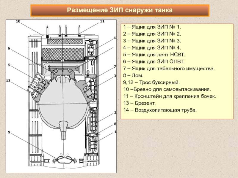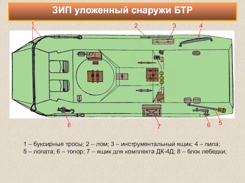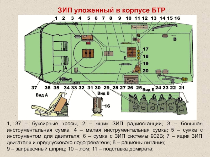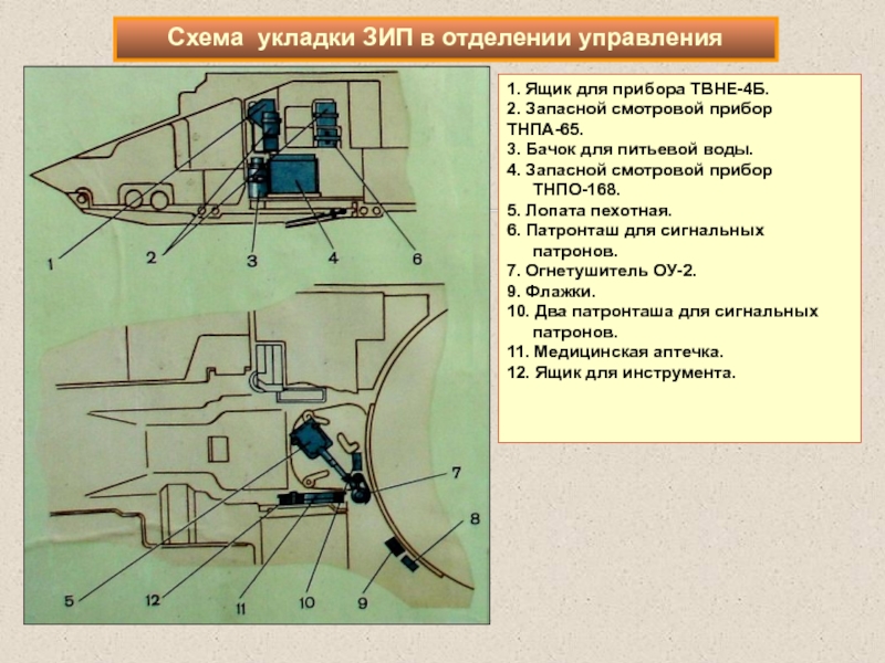 – малая инструментальная сумка; 5 – сумка с инструментом для двигателя; 6 – сумка с ЗИП системы 902В; 7 – ящик ЗИП двигателя и предпускового подогревателя; 8 – рационы питания;