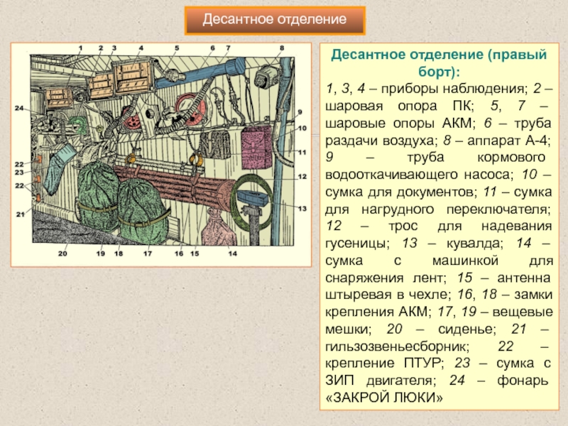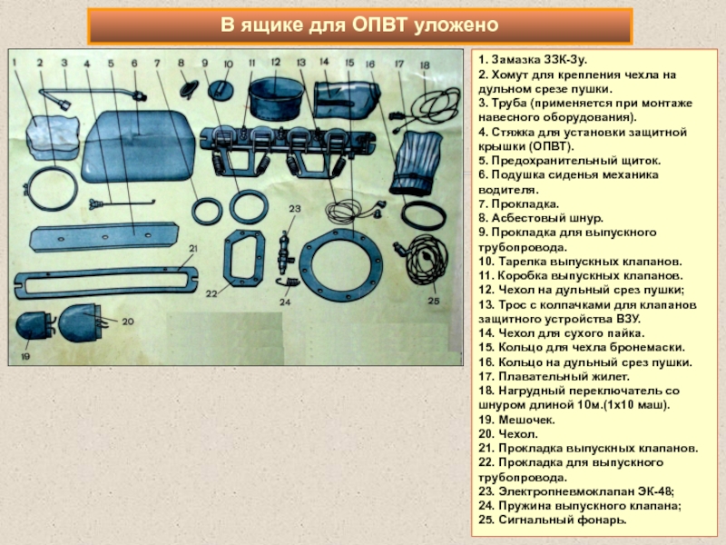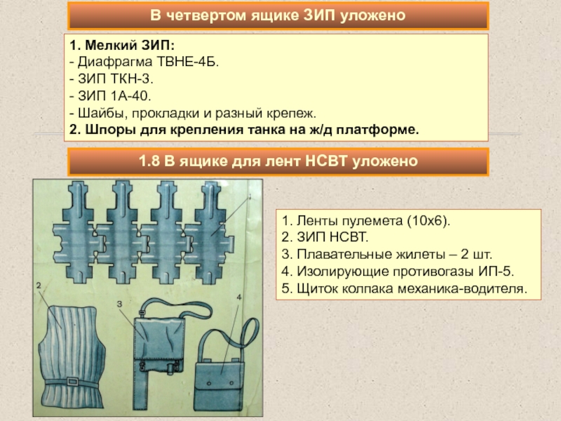 предметы герметизации корпуса, пушки при преодолении водной преграды по дну, плавательные жилеты и изолирующие противогазы для экипажа ;