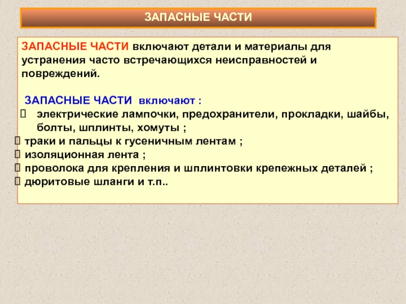 Слайд 7ЗАПАСНЫЕ ЧАСТИ включают детали и материалы для устранения часто встречающихся