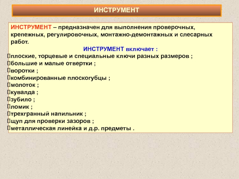 Слайд 8ИНСТРУМЕНТ – предназначен для выполнения проверочных, крепежных, регулировочных, монтажно-демонтажных и