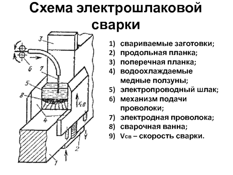 2) Электрошлаковая сварка (источник теплоты – тепло, аккумулируемое в сварочной ванне).