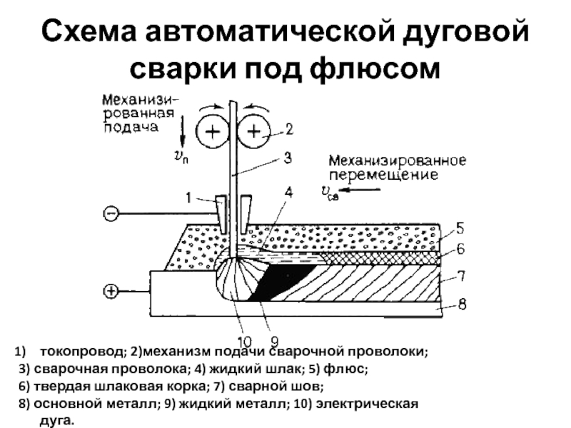 Слайд 10Схема автоматической дуговой сварки под флюсом