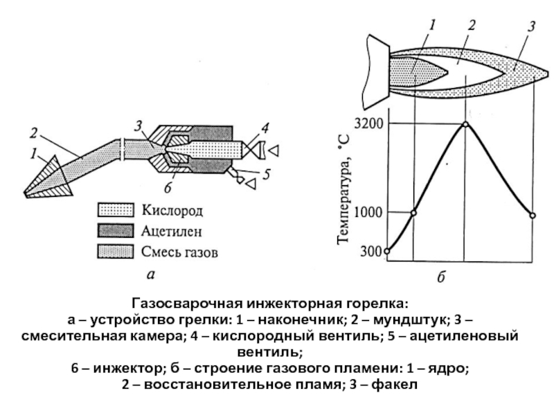6 – инжектор; б – строение газового пламени: 1 – ядро;