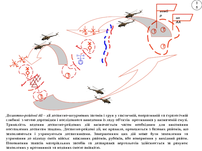 виведення із ладу об'єктів противника у визначеній смузі. Тривалість ведення десантно-рейдових дій визначається часом необхідним для виконання поставлених десантам завдань. Десантно-рейдові дії, як правило, проводяться з базових районів, що захоплюються і утримуються десантниками. Завершенням цих дій може бути захоплення та утримання до підходу своїх військ важливих районів, рубежів, або повернення у вихідний район. Поповнення запасів матеріальних засобів та дозаправка вертольотів здійснюється за рахунок захоплених у противника та поданих своєю авіацією.