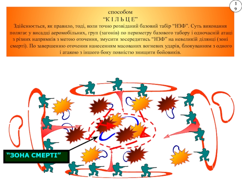 висадці аеромобільних, груп (загонів) по периметру базового табору і одночасній атаці з різних напрямків з метою оточення, змусити зосередитись “НЗФ” на невеликій ділянці (зоні смерті). По завершенню оточення нанесенням масованих вогневих ударів, блокуванням з одного і атакою з іншого боку повністю знищити бойовиків.