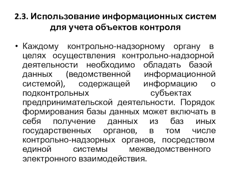 системой), содержащей информацию о подконтрольных субъектах предпринимательской деятельности. Порядок формирования базы данных может включать в себя получение данных из баз иных государственных органов, в том числе контрольно-надзорных органов, посредством единой системы межведомственного электронного взаимодействия.