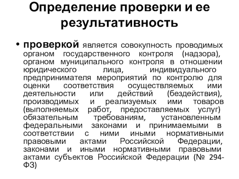 предпринимателя мероприятий по контролю для оценки соответствия осуществляемых ими деятельности или действий (бездействия), производимых и реализуемых ими товаров (выполняемых работ, предоставляемых услуг) обязательным требованиям, установленным федеральными законами и принимаемыми в соответствии с ними иными нормативными правовыми актами Российской Федерации, законами и иными нормативными правовыми актами субъектов Российской Федерации (№ 294-ФЗ)