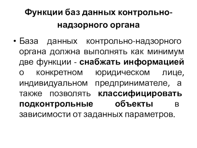 Слайд 13Функции баз данных контрольно-надзорного органа