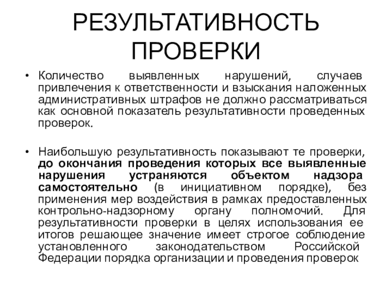 Наибольшую результативность показывают те проверки, до окончания проведения которых все выявленные нарушения устраняются объектом надзора самостоятельно (в инициативном порядке), без применения мер воздействия в рамках предоставленных контрольно-надзорному органу полномочий. Для результативности проверки в целях использования ее итогов решающее значение имеет строгое соблюдение установленного законодательством Российской Федерации порядка организации и проведения проверок