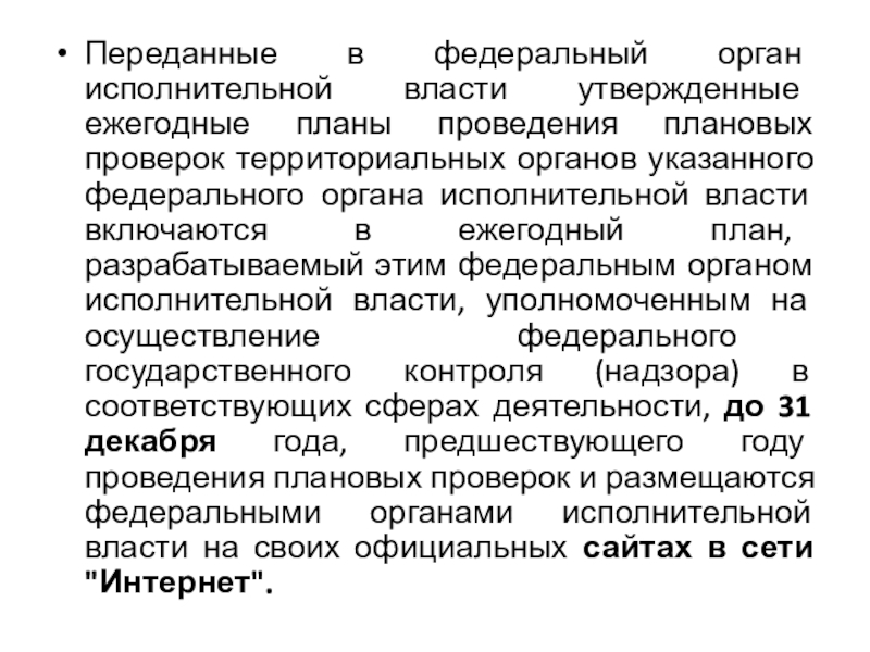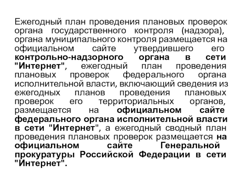 в сети "Интернет", ежегодный план проведения плановых проверок федерального органа исполнительной власти, включающий сведения из ежегодных планов проведения плановых проверок его территориальных органов, размещается на официальном сайте федерального органа исполнительной власти в сети "Интернет", а ежегодный сводный план проведения плановых проверок размещается на официальном сайте Генеральной прокуратуры Российской Федерации в сети "Интернет".