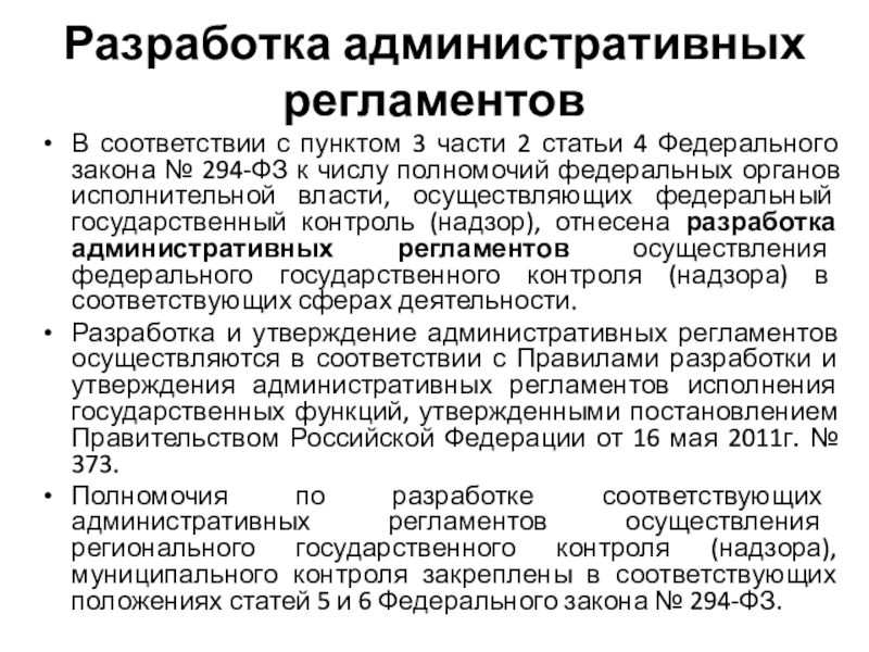 Полномочия по разработке соответствующих административных регламентов осуществления регионального государственного контроля (надзора), муниципального контроля закреплены в соответствующих положениях статей 5 и 6 Федерального закона № 294-ФЗ.