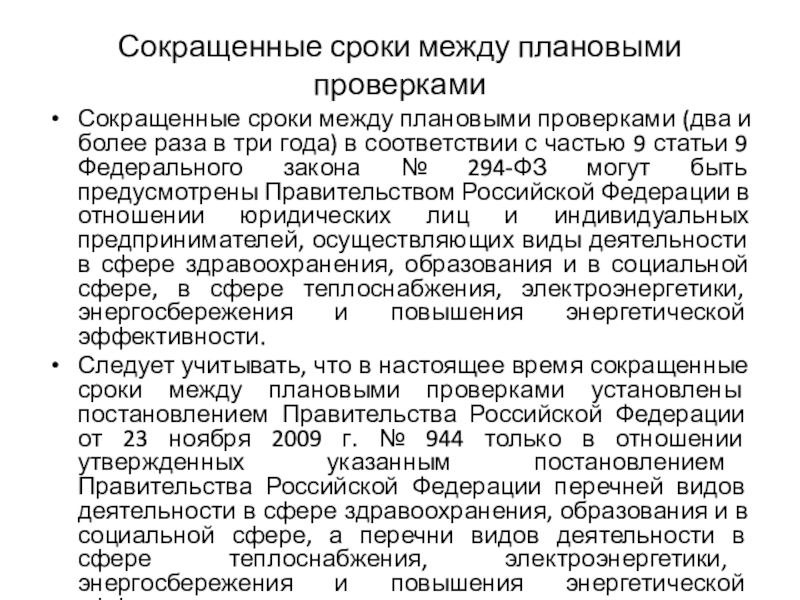 Следует учитывать, что в настоящее время сокращенные сроки между плановыми проверками установлены постановлением Правительства Российской Федерации от 23 ноября 2009 г. № 944 только в отношении утвержденных указанным постановлением Правительства Российской Федерации перечней видов деятельности в сфере здравоохранения, образования и в социальной сфере, а перечни видов деятельности в сфере теплоснабжения, электроэнергетики, энергосбережения и повышения энергетической эффективности не утверждены.
