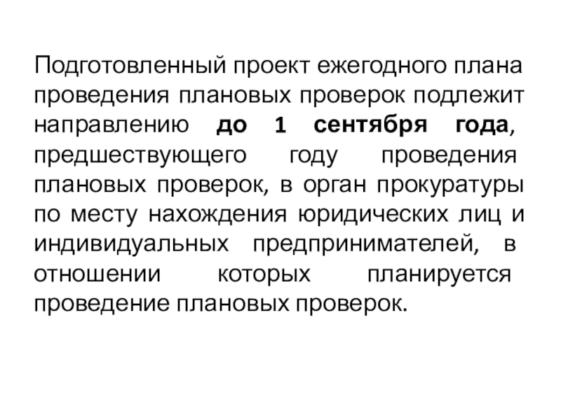 Слайд 31Подготовленный проект ежегодного плана проведения плановых проверок подлежит направлению до