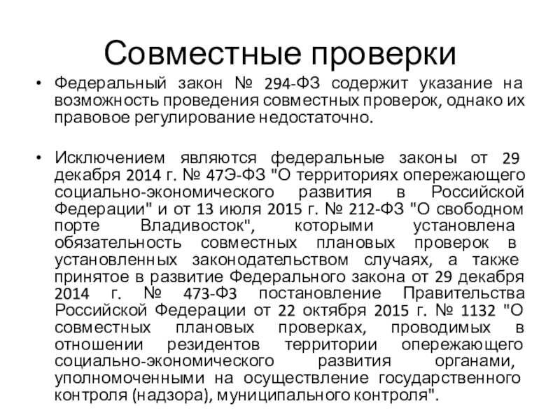 от 29 декабря 2014 г. № 47Э-ФЗ "О территориях опережающего социально-экономического развития в Российской Федерации" и от 13 июля 2015 г. № 212-ФЗ "О свободном порте Владивосток", которыми установлена обязательность совместных плановых проверок в установленных законодательством случаях, а также принятое в развитие Федерального закона от 29 декабря 2014 г. № 473-Ф3 постановление Правительства Российской Федерации от 22 октября 2015 г. № 1132 "О совместных плановых проверках, проводимых в отношении резидентов территории опережающего социально-экономического развития органами, уполномоченными на осуществление государственного контроля (надзора), муниципального контроля".