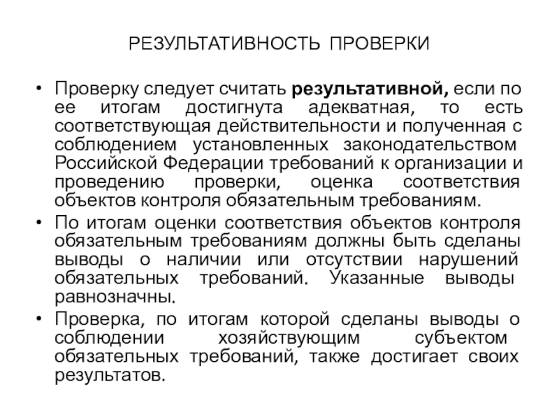 законодательством Российской Федерации требований к организации и проведению проверки, оценка соответствия объектов контроля обязательным требованиям.
