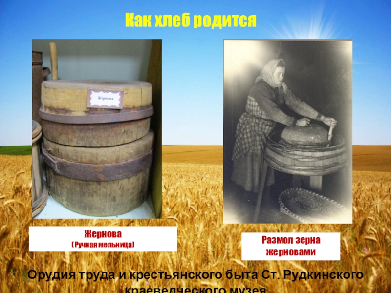 Как хлеб родитсяОрудия труда и крестьянского быта Ст. Рудкинского краеведческого музеяЖернова (Ручная мельница)Размол зерна жерновами