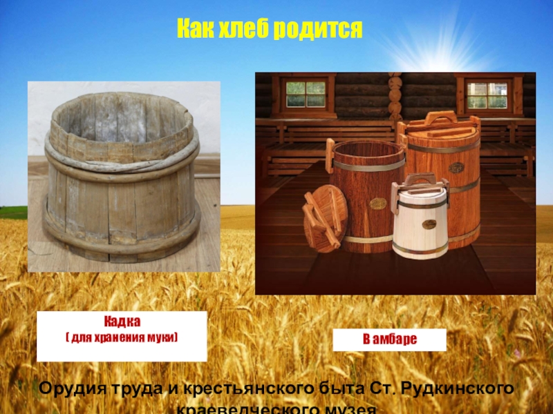 Как хлеб родитсяОрудия труда и крестьянского быта Ст. Рудкинского краеведческого музеяКадка( для хранения муки)В амбаре
