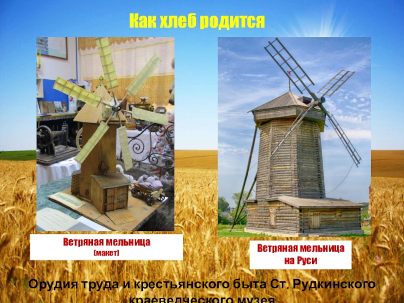 Как хлеб родитсяОрудия труда и крестьянского быта Ст. Рудкинского краеведческого музеяВетряная мельница (макет)Ветряная мельница на Руси