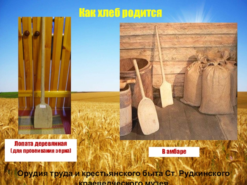 Как хлеб родитсяОрудия труда и крестьянского быта Ст. Рудкинского краеведческого музеяЛопата деревянная( для провеивания зерна)В амбаре