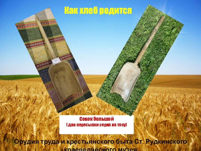 Как хлеб родитсяОрудия труда и крестьянского быта Ст. Рудкинского краеведческого музеяСовок(Для пересыпки зерна в домашних условиях)