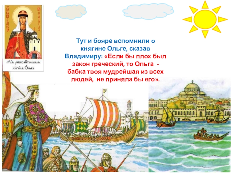 Слайд 12Тут и бояре вспомнили о княгине Ольге, сказав Владимиру: «Если