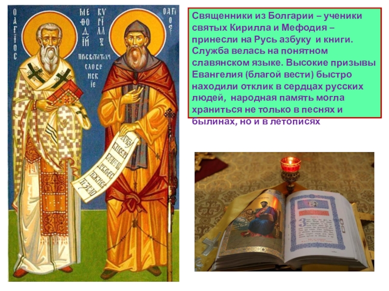 принесли на Русь азбуку и книги. Служба велась на понятном