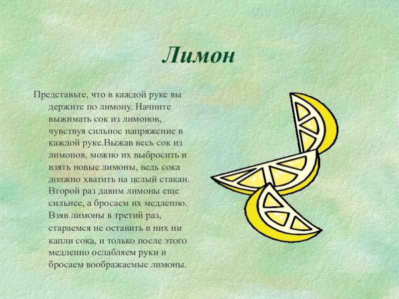 весь сок из лимонов, можно их выбросить и взять новые лимоны, ведь сока должно хватить на целый стакан. Второй раз давим лимоны еще сильнее, а бросаем их медленно. Взяв лимоны в третий раз, стараемся не оставить в них ни капли сока, и только после этого медленно ослабляем руки и бросаем воображаемые лимоны.