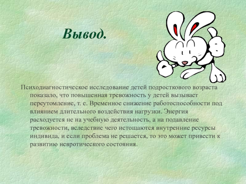 е. Временное снижение работоспособности под влиянием длительного воздействия нагрузки. Энергия расходуется не на учебную деятельность, а на подавление тревожности, вследствие чего истощаются внутренние ресурсы индивида, и если проблема не решается, то это может привести к развитию невротического состояния.