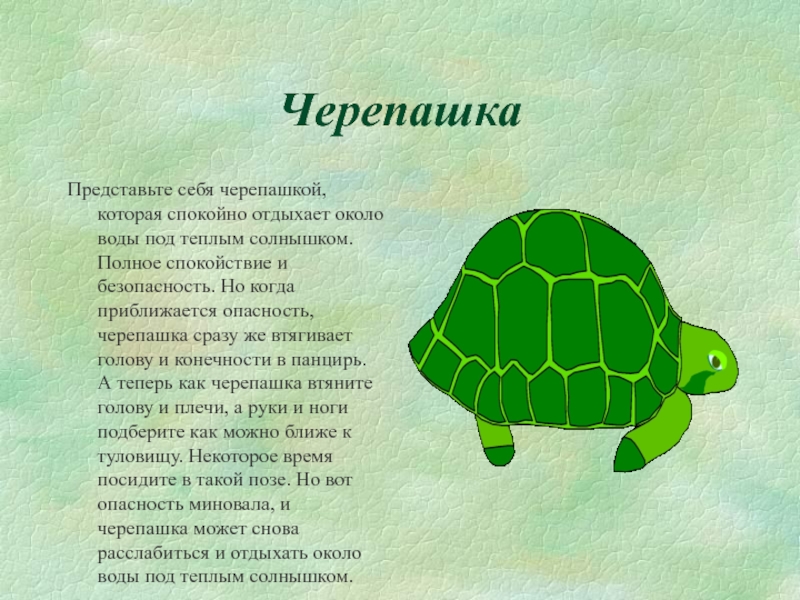 сразу же втягивает голову и конечности в панцирь. А теперь как черепашка втяните голову и плечи, а руки и ноги подберите как можно ближе к туловищу. Некоторое время посидите в такой позе. Но вот опасность миновала, и черепашка может снова расслабиться и отдыхать около воды под теплым солнышком.