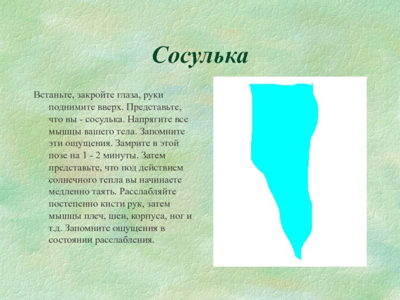 в этой позе на 1 - 2 минуты. Затем представьте, что под действием солнечного тепла вы начинаете медленно таять. Расслабляйте постепенно кисти рук, затем мышцы плеч, шеи, корпуса, ног и т.д. Запомните ощущения в состоянии расслабления.