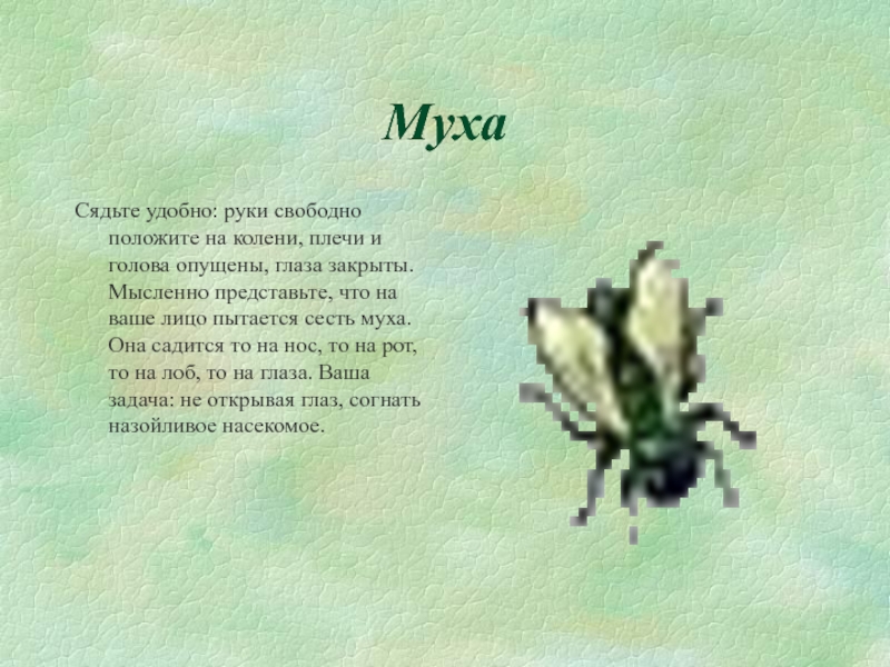 сесть муха. Она садится то на нос, то на рот, то на лоб, то на глаза. Ваша задача: не открывая глаз, согнать назойливое насекомое.