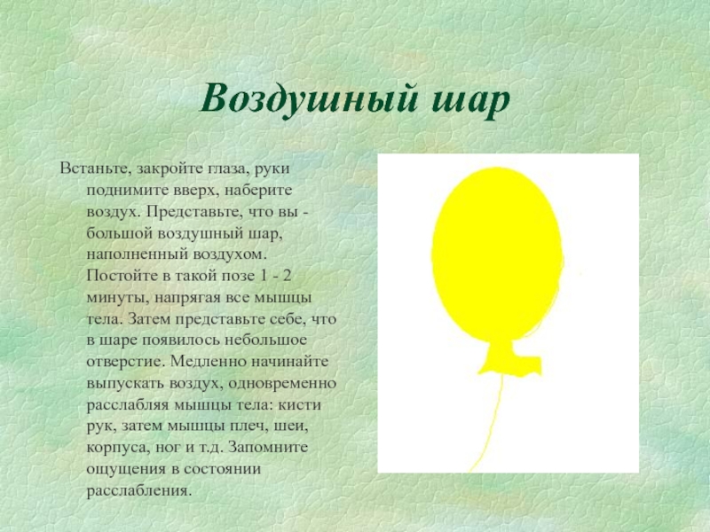 такой позе 1 - 2 минуты, напрягая все мышцы тела. Затем представьте себе, что в шаре появилось небольшое отверстие. Медленно начинайте выпускать воздух, одновременно расслабляя мышцы тела: кисти рук, затем мышцы плеч, шеи, корпуса, ног и т.д. Запомните ощущения в состоянии расслабления.