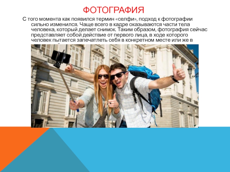 который делает снимок. Таким образом, фотография сейчас представляет собой действие от первого лица, в ходе которого человек пытается запечатлеть себя в конкретном месте или же в конкретный момент.
