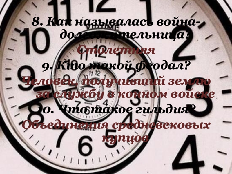 8. Как называлась война-долгожительница?Столетняя 9. Кто такой феодал?Человек, получивший землю за службу в конном войске 10. Что