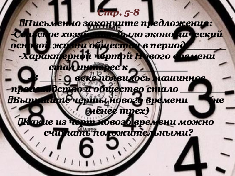 Стр. 5-8Письменно закончите предложения:Сельское хозяйство было экономический основой жизни общества в период ______Характерной чертой Нового времени стал