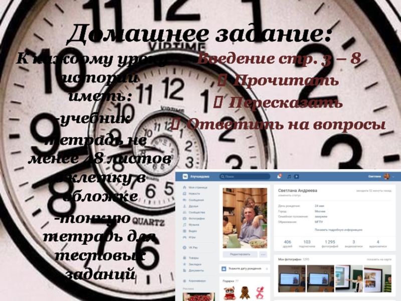 Домашнее задание:Введение стр. 3 – 8ПрочитатьПересказатьОтветить на вопросыК каждому уроку истории иметь:-учебник-тетрадь не менее 48 листов в
