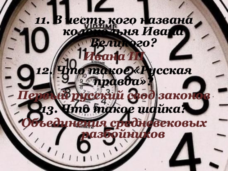 11. В честь кого названа колокольня Ивана Великого?Ивана III 12. Что такое «Русская правда»?Первый русский свод законов13.
