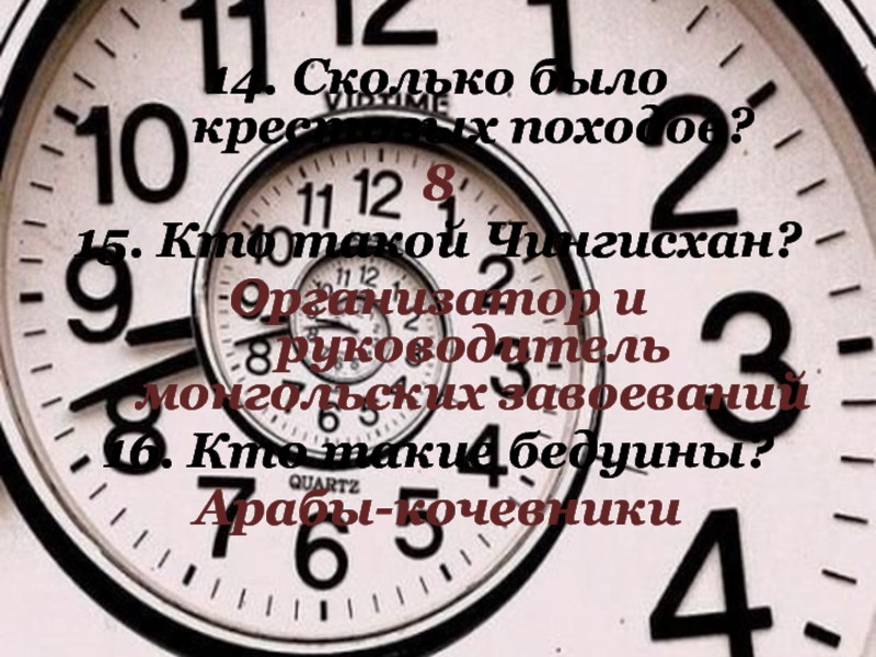 14. Сколько было крестовых походов?815. Кто такой Чингисхан?Организатор и руководитель монгольских завоеваний16. Кто такие бедуины?Арабы-кочевники