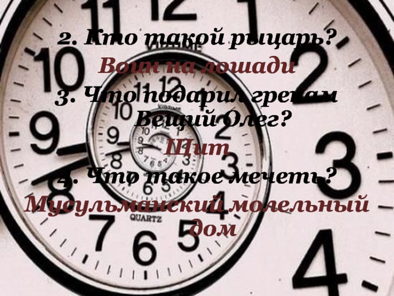 2. Кто такой рыцарь?Воин на лошади3. Что подарил грекам Вещий Олег?Щит 4. Что такое мечеть?Мусульманский молельный дом