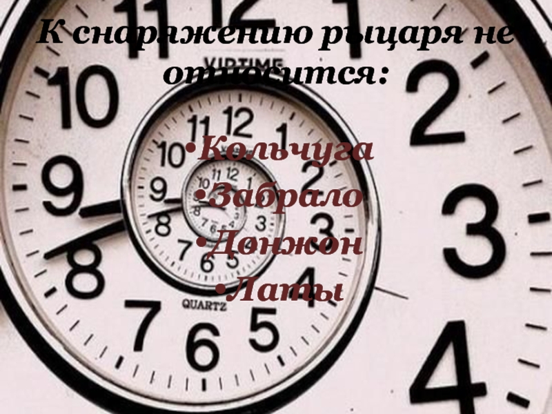 К снаряжению рыцаря не относится:КольчугаЗабралоДонжонЛаты
