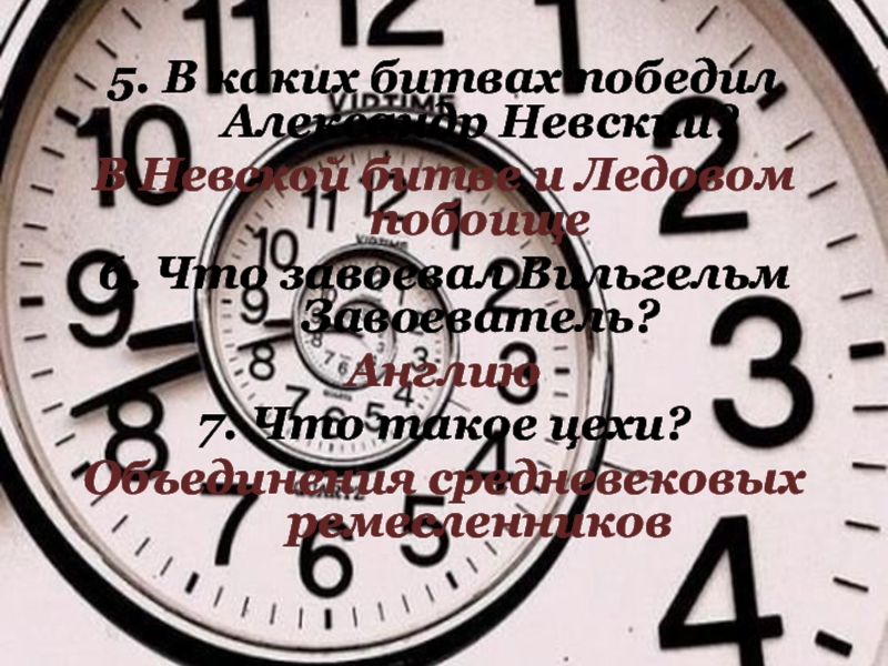 5. В каких битвах победил Александр Невский?В Невской битве и Ледовом побоище6. Что завоевал Вильгельм Завоеватель?Англию 7.