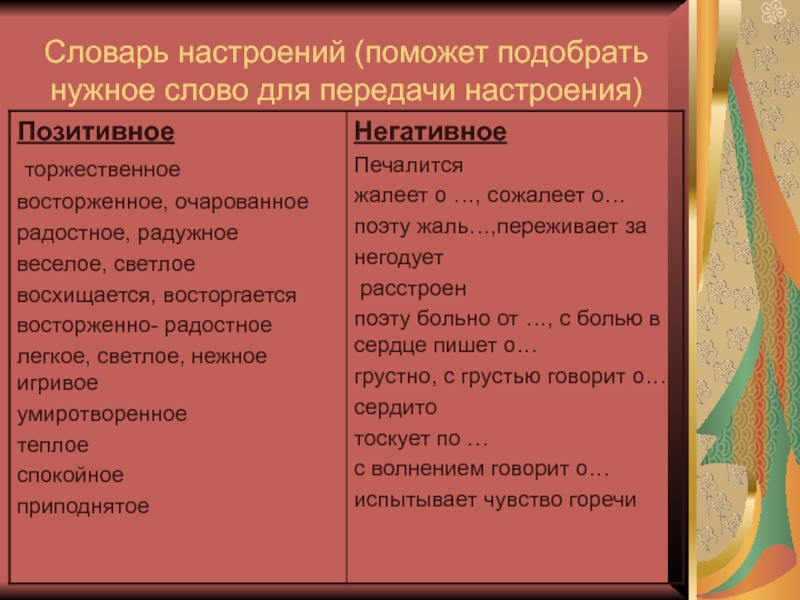 Какие чувства передаёт поэт в стихотворении? Какие именно ключевые слова формируют эти чувства? Запиши в черновик, пользуясь при затруднении словарём настроений (смотри ниже).