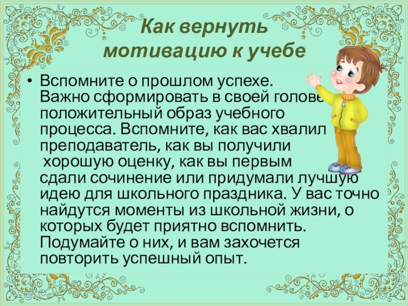 сдали сочинение или придумали лучшую идею для школьного праздника. У вас точно найдутся моменты из школьной жизни, о которых будет приятно вспомнить. Подумайте о них, и вам захочется повторить успешный опыт.