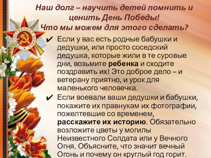 Если воевали ваши дедушки и бабушки, покажите их правнукам их фотографии, пожелтевшие со временем, расскажите их историю. Обязательно возложите цветы у могилы Неизвестного Солдата или у Вечного Огня. Объясните, что значит вечный Огонь и почему он круглый год горит.