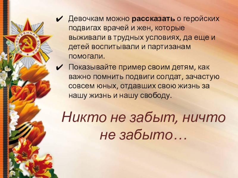 Показывайте пример своим детям, как важно помнить подвиги солдат, зачастую совсем юных, отдавших свою жизнь за нашу жизнь и нашу свободу.