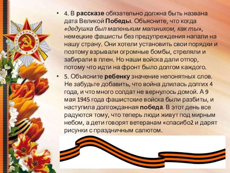 5. Объясните ребенку значение непонятных слов. Не забудьте добавить, что война длилась долгих 4 года, и что много солдат не вернулось домой. А 9 мая 1945 года фашистские войска были разбиты, и наступила долгожданная победа. В этот день все радуются тому, что теперь люди живут под мирным небом, а дети говорят ветеранам «спасибо2 и дарят рисунки с праздничным салютом.